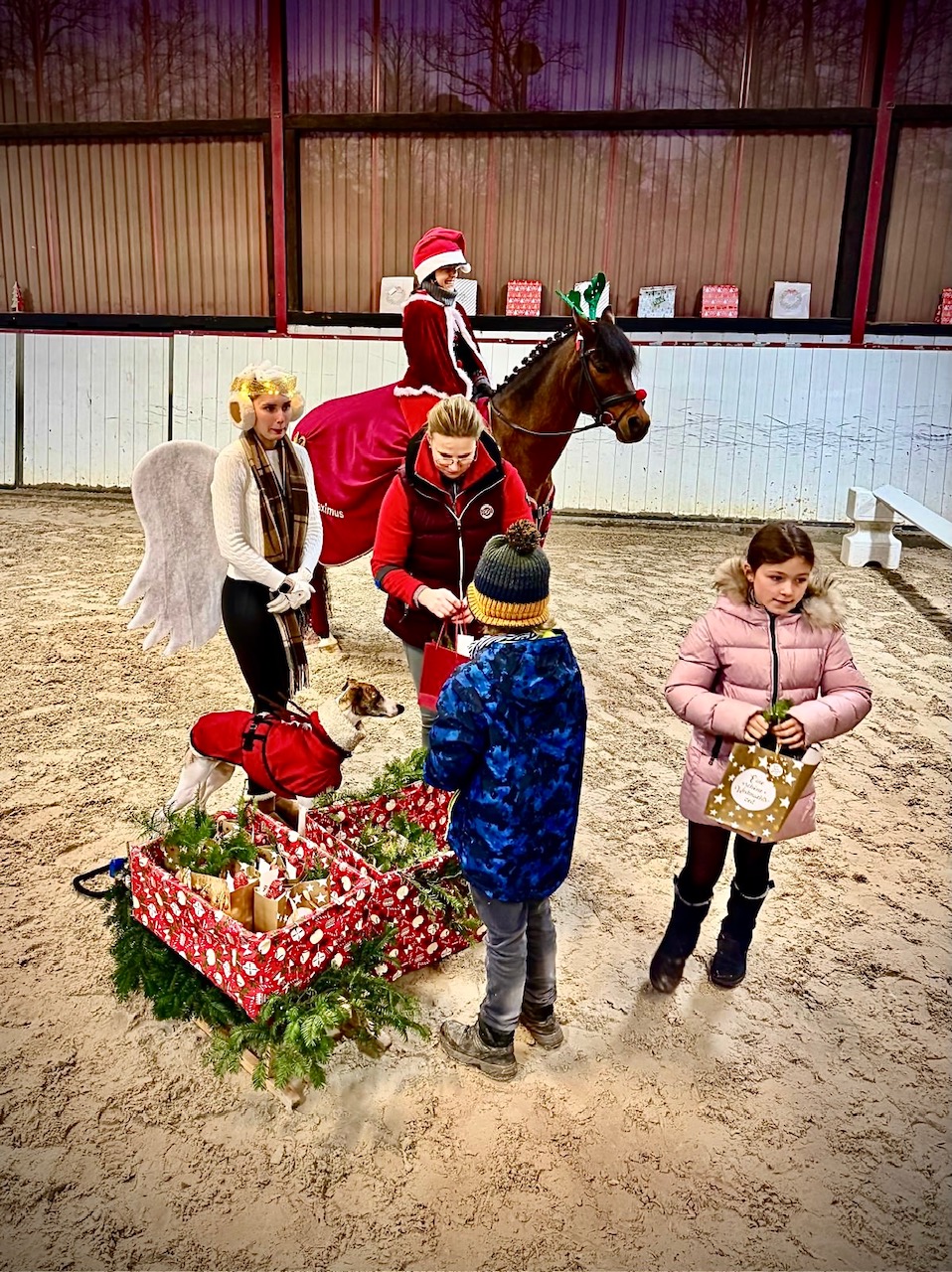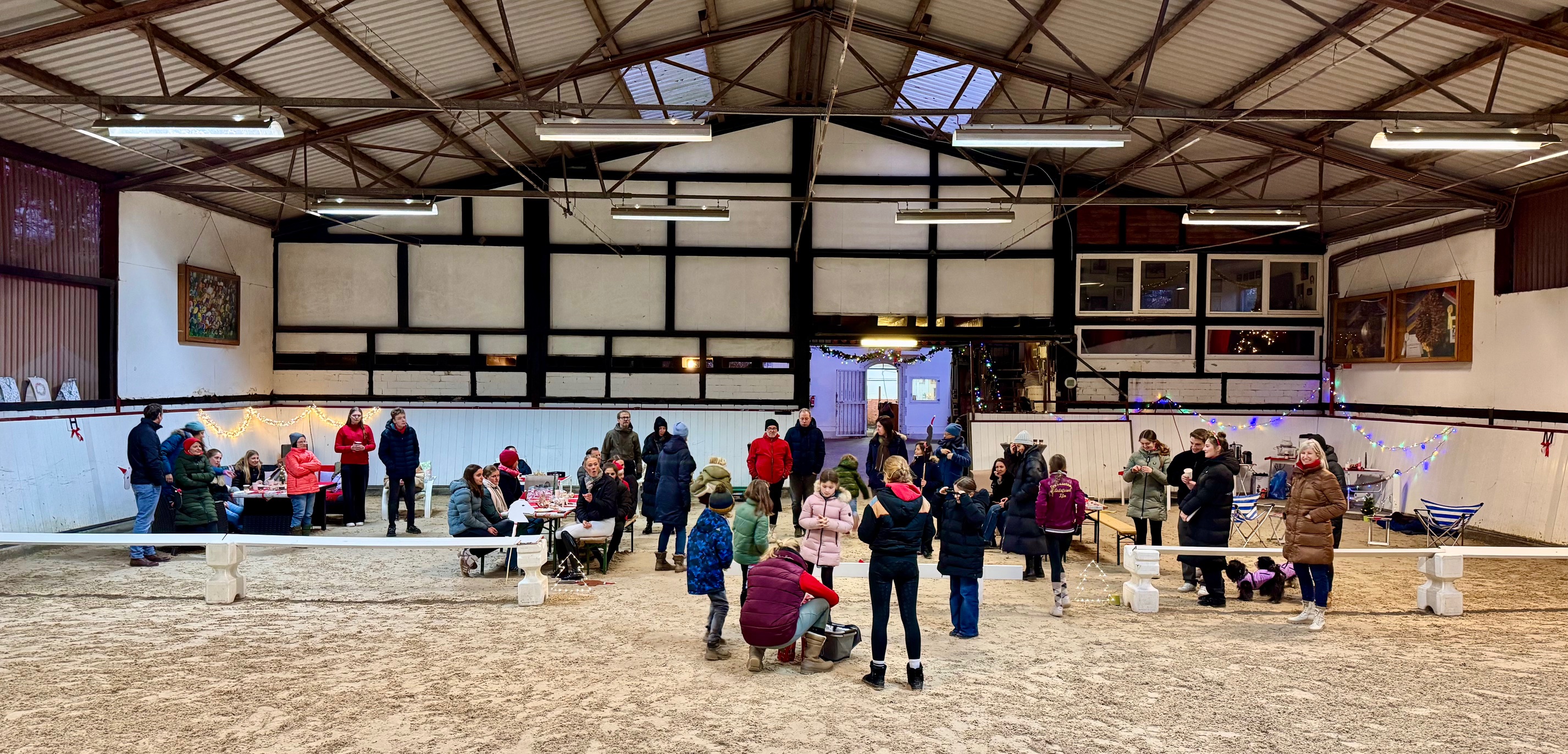 In der festlich geschmückten Reithalle fand am 14.12. die gemeinsame Weihnachtsfeier statt. Die Mitglieder kamen zahlreich zusammen und genossen die gemütliche Atmosphäre zwischen Lichterketten und weihnachtlicher Dekoration. Für das leibliche Wohl war bestens gesorgt: Es gab selbst gebackene Plätzchen und Kuchen, dazu heißer Glühwein und fruchtiger Punsch, die für wohlige Wärme sorgten. In entspannter Runde wurde gelacht, erzählt und das Vereinsjahr Revue passieren gelassen. Ein besonderes Highlight des Nachmittags war ein Pas de deux, das von Vereinsmitgliedern gezeigt wurde und viel Applaus erhielt. Auch die Steckenpferd-Quadrille sorgte für beste Stimmung und begeisterte das Publikum. Krönender Abschluß war die Bescherung: Santa kam geritten und zog einen Schlitten voller Geschenke. Insgesamt war es ein stimmungsvoller Abend, der Gemeinschaft und Vereinsleben wunderbar in den Mittelpunkt stellte. Wir bedanken uns bei allen Helferinnen und Helfern und freuen uns schon auf die nächste gemeinsame Veranstaltung.